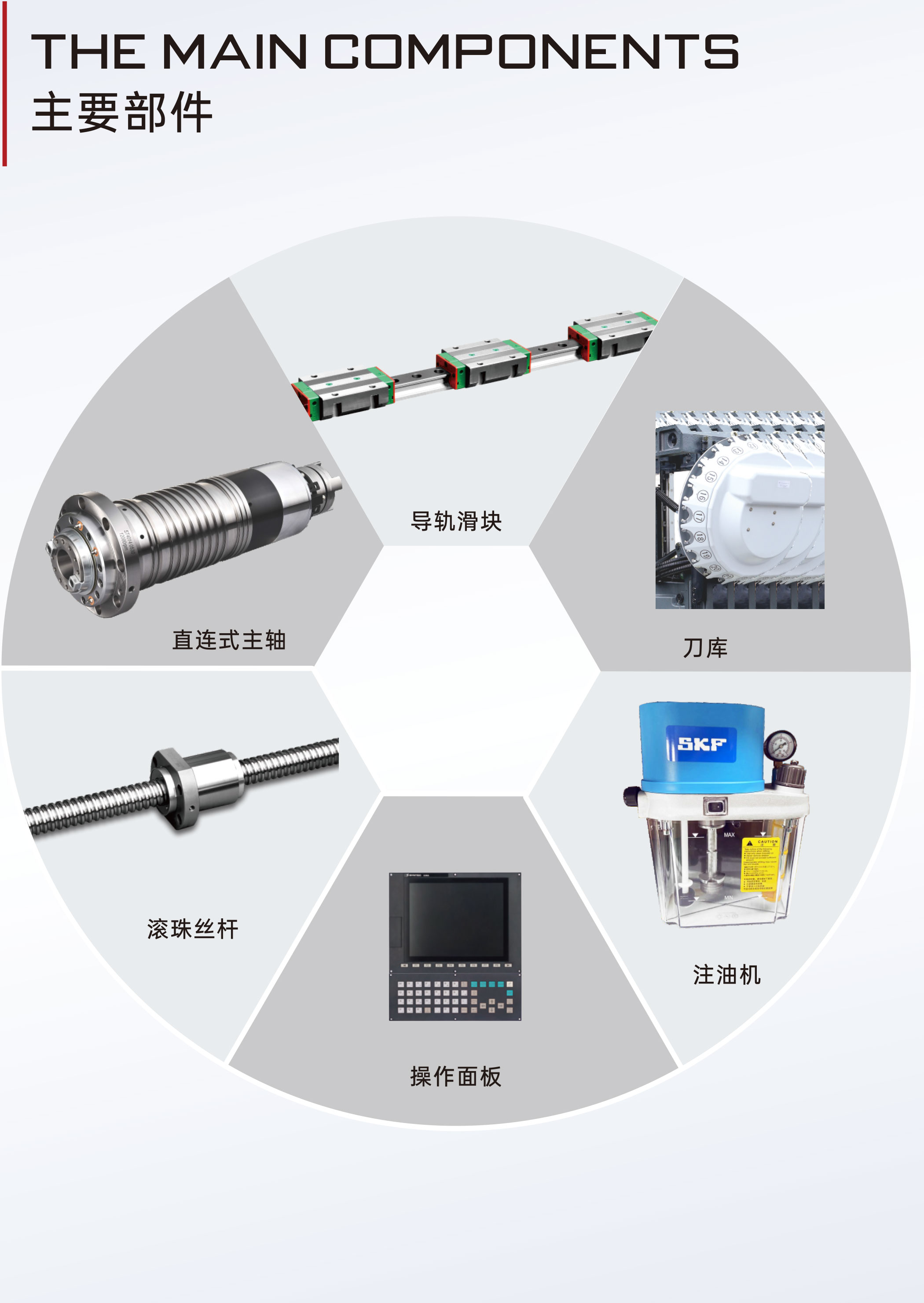 3. 三軸均采用重載型滾柱直線導(dǎo)軌,剛性好,精度高,非常適用于重切削。